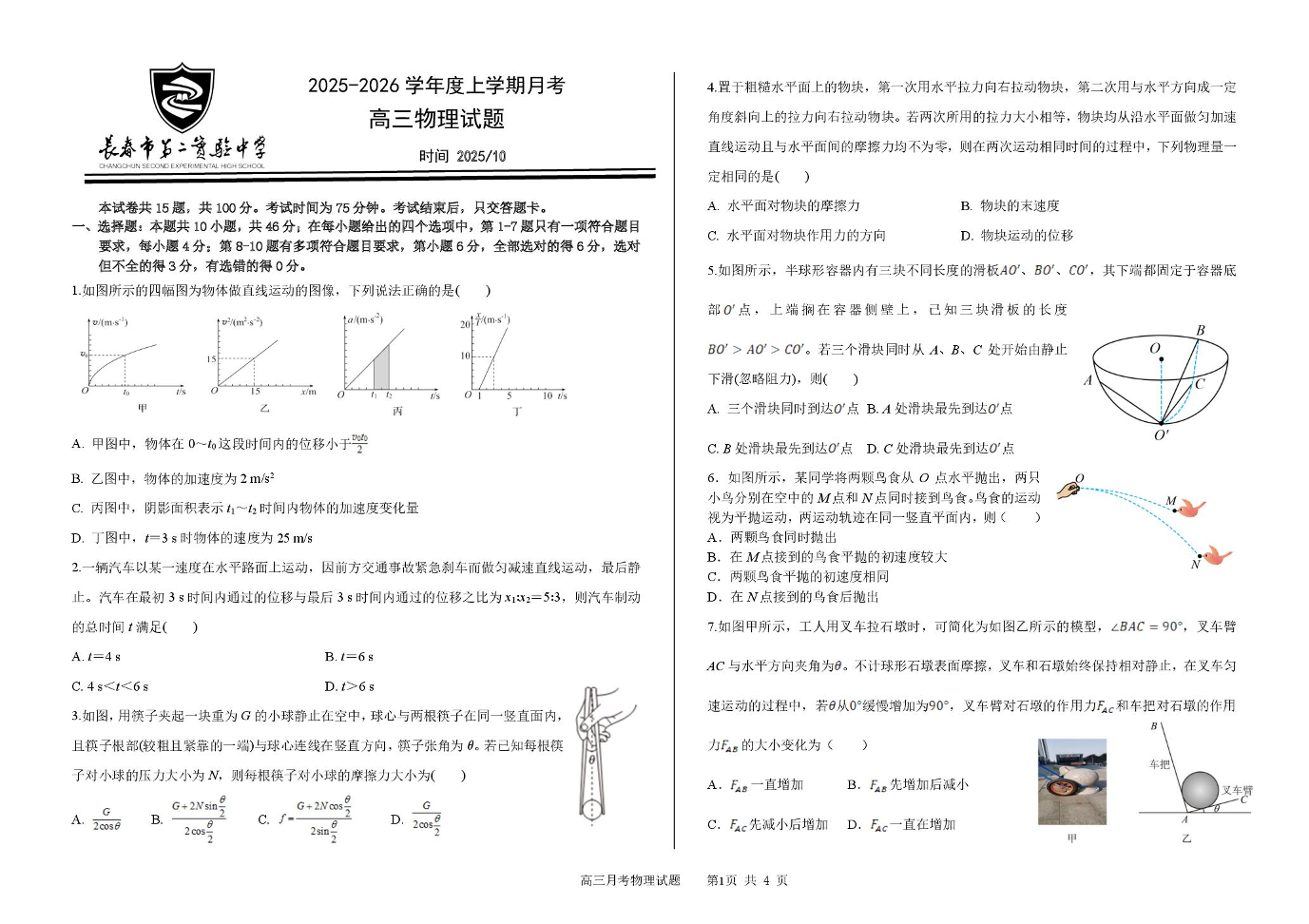 吉林省长春市第二实验中学2026届高三上学期10月月考 物理.pdf