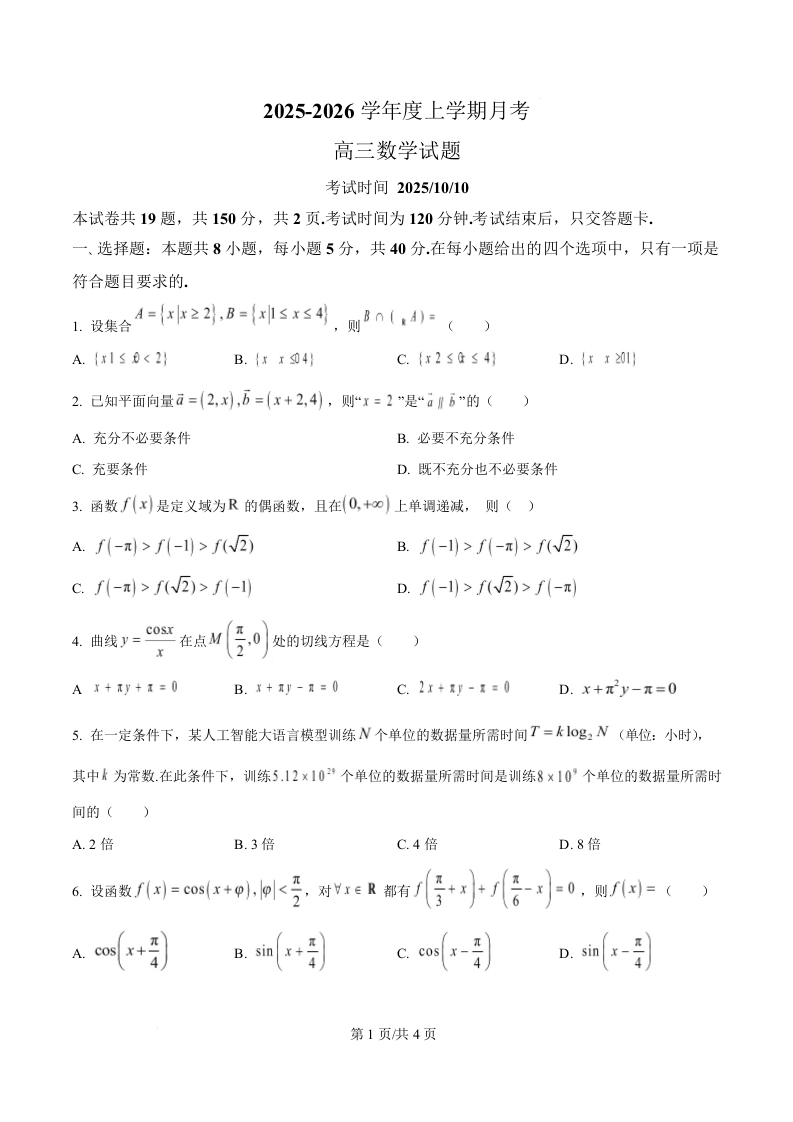 吉林省长春市第二实验中学2026届高三上学期10月月考 数学.docx