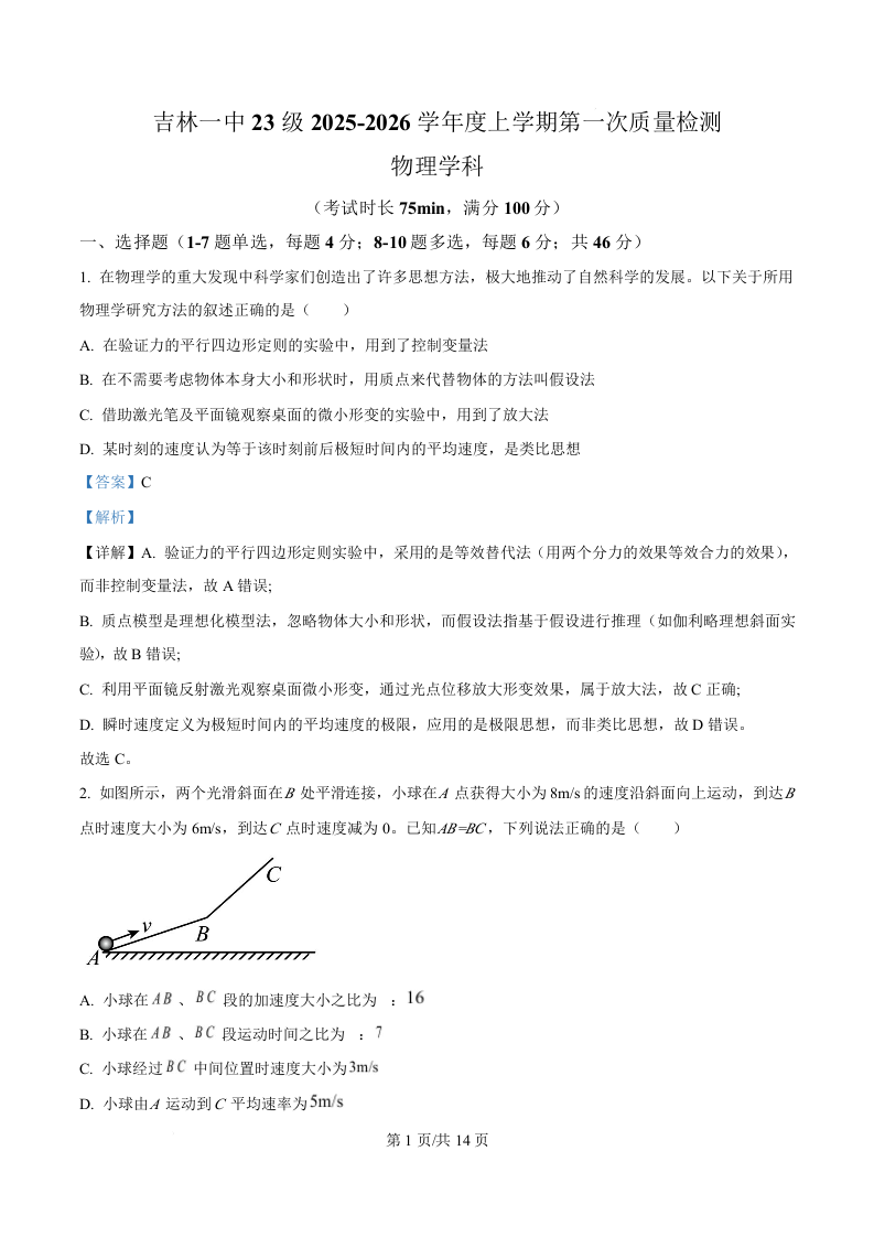 吉林省吉林市第一中学2026届高三上学期第一次质量检测 物理答案.docx