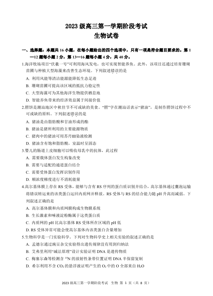 汕头市金山中学2023级高三第一学期阶段考试 生物.pdf