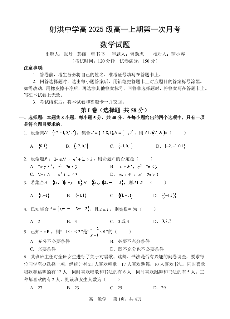 射洪中学高2025级高一上期第一次月考 数学.docx