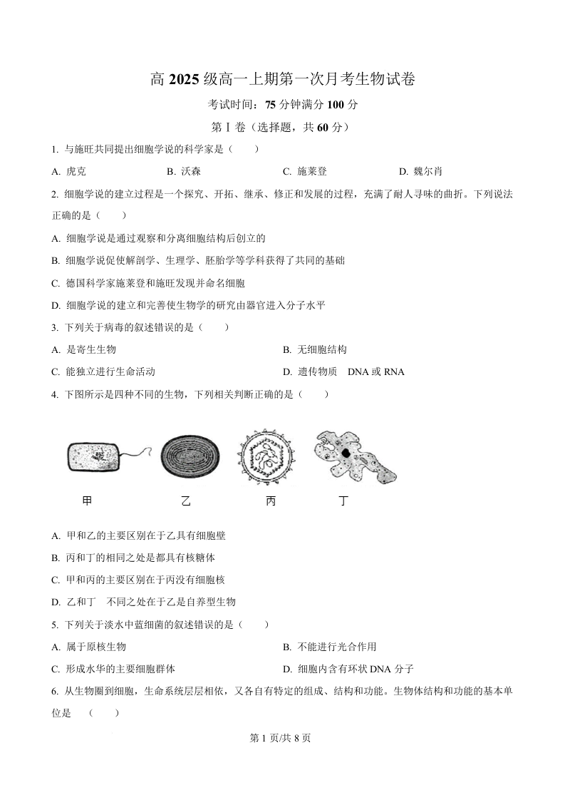 四川省南充市嘉陵第一中学2025-2026学年高一上学期第一次月考 生物.docx