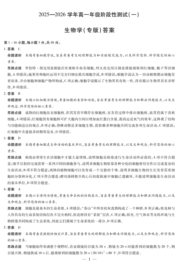 陕西省天一大联考2025-2026学年高一年级阶段性测试(一)生物答案.pdf