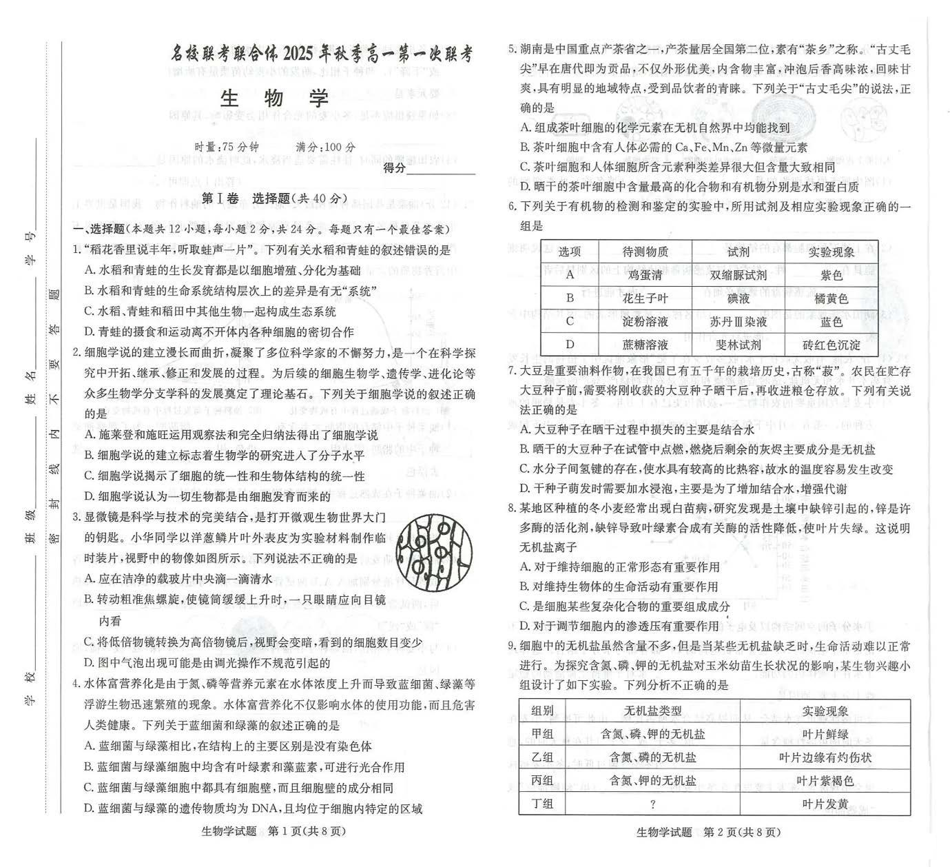 湖南名校联考联合体2025年秋季高一第一次联考 生物.pdf