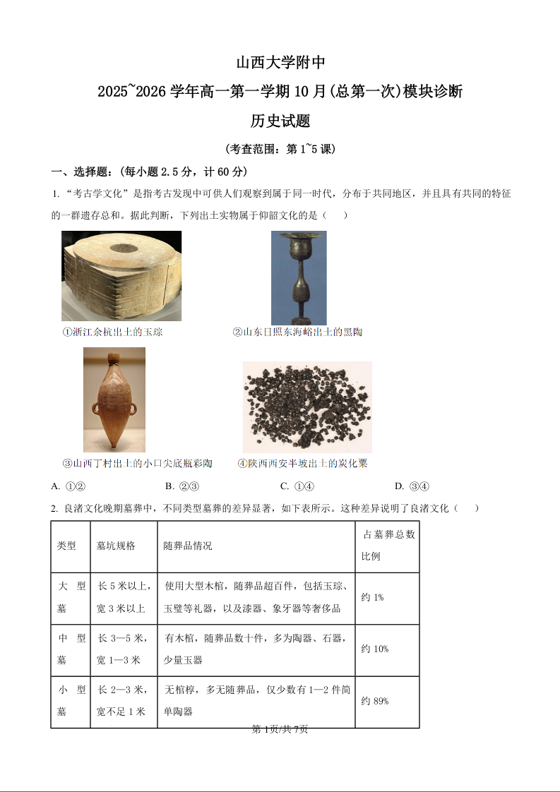 山大附中2025-2026学年第一学期高一年级10月模块诊断 历史.docx