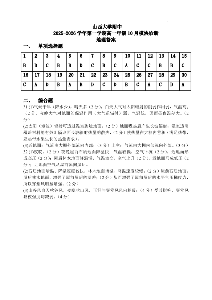山大附中2025-2026学年第一学期高一年级10月模块诊断 地理答案.pdf