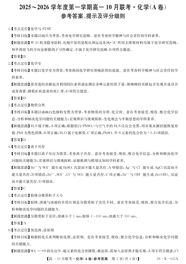 安徽省县中联盟2025~2026学年度第一学期高一10月联考 化学(A卷)答案.pdf