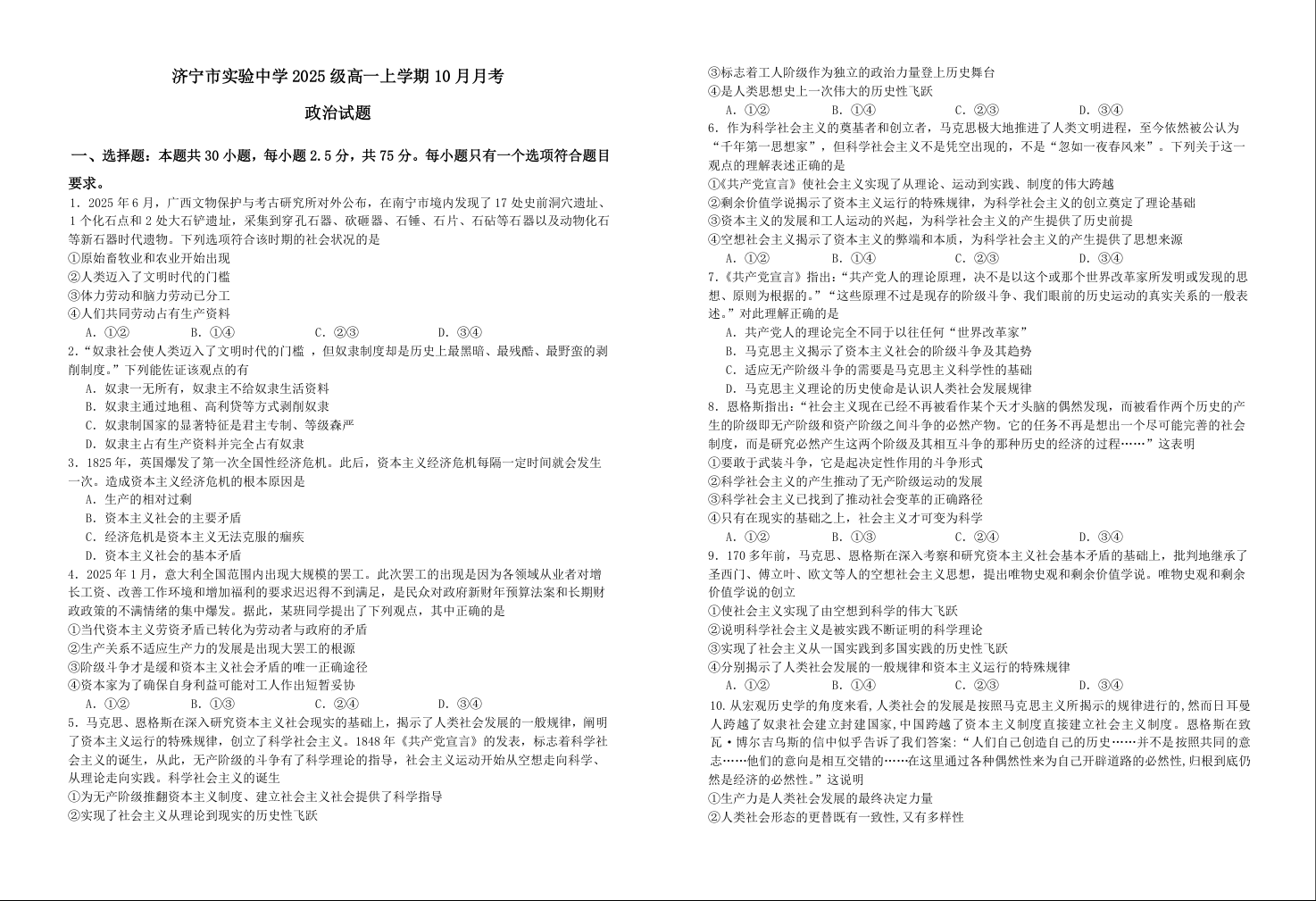 山东省济宁市实验中学2025-2026学年高一上学期10月月考 政治.docx