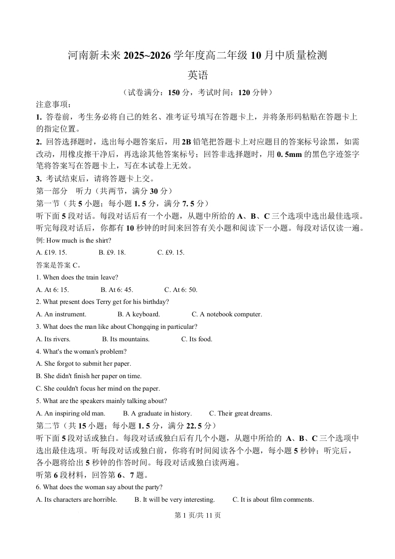 河南省新未来联考2025-2026学年高二10月中质量检测 英语.docx