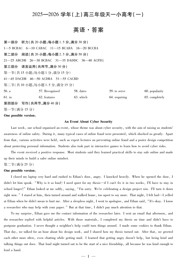 河南省2025-2026学年(上)高三年级天一小高考(一)英语答案.pdf