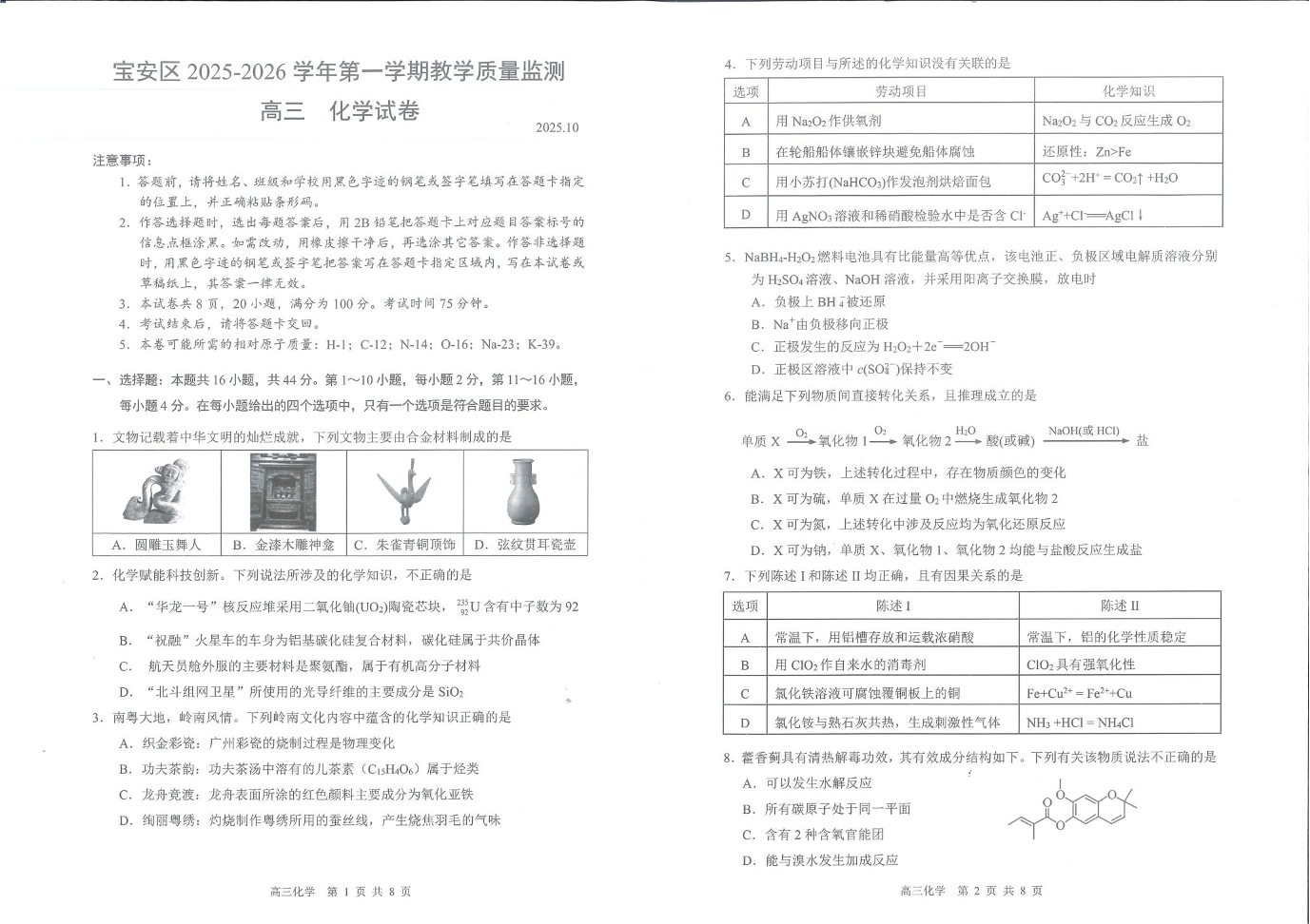 广东省深圳市宝安区2025-2026学年高三上学期教学质量检测 化学.pdf