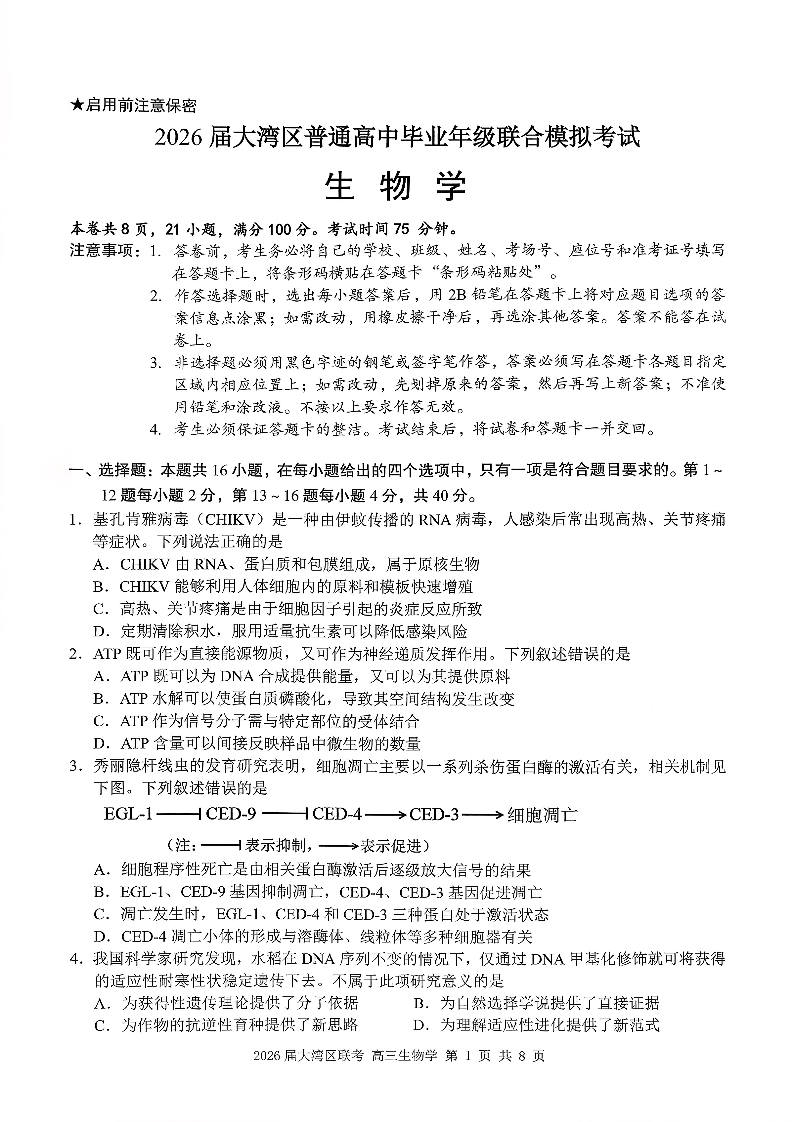 广东省大湾区2026届普通高中毕业年级联合模拟考试 生物.pdf