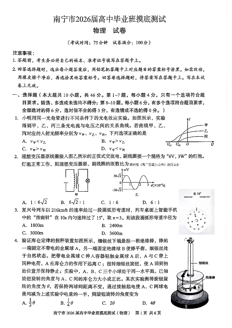 南宁市2026届高中毕业班摸底测试 物理.pdf