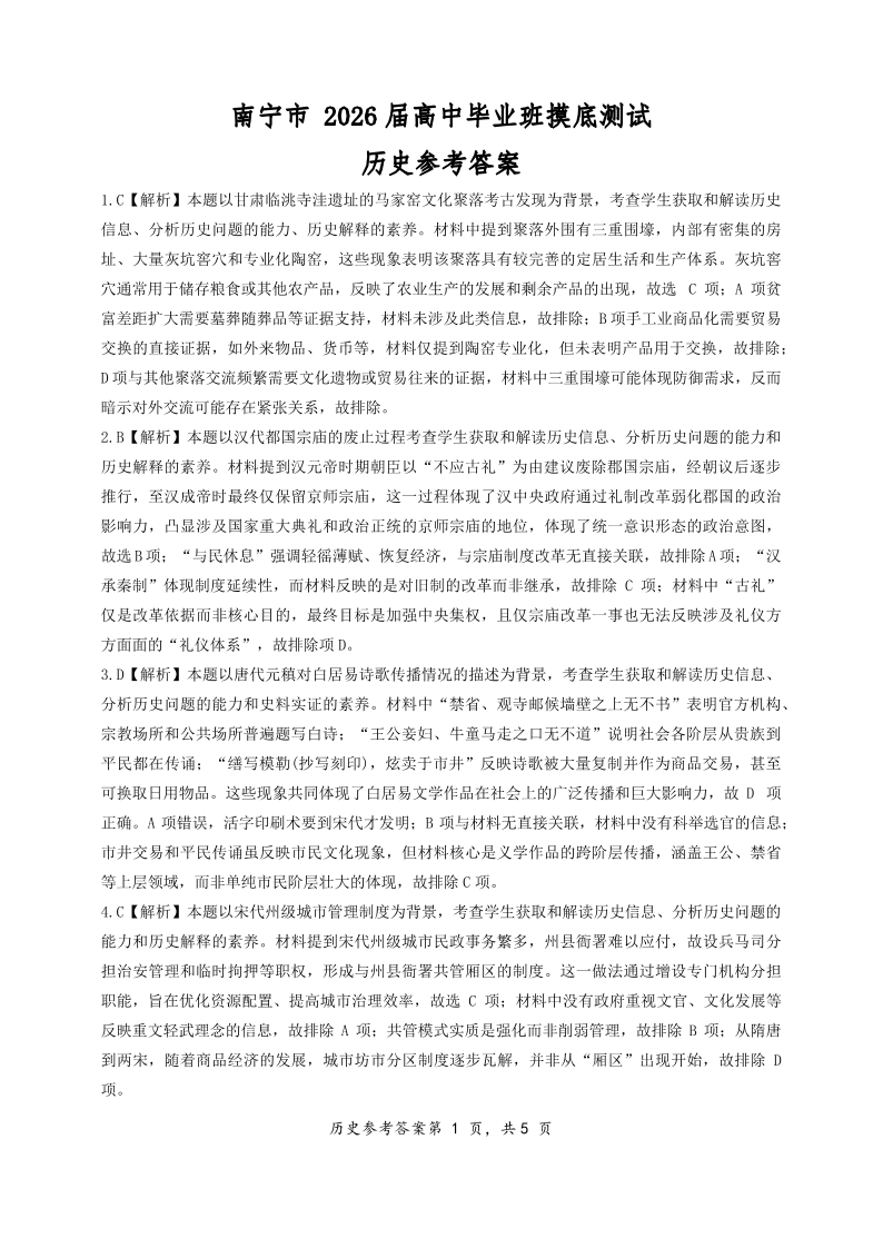 南宁市2026届高中毕业班摸底测试 历史答案.pdf