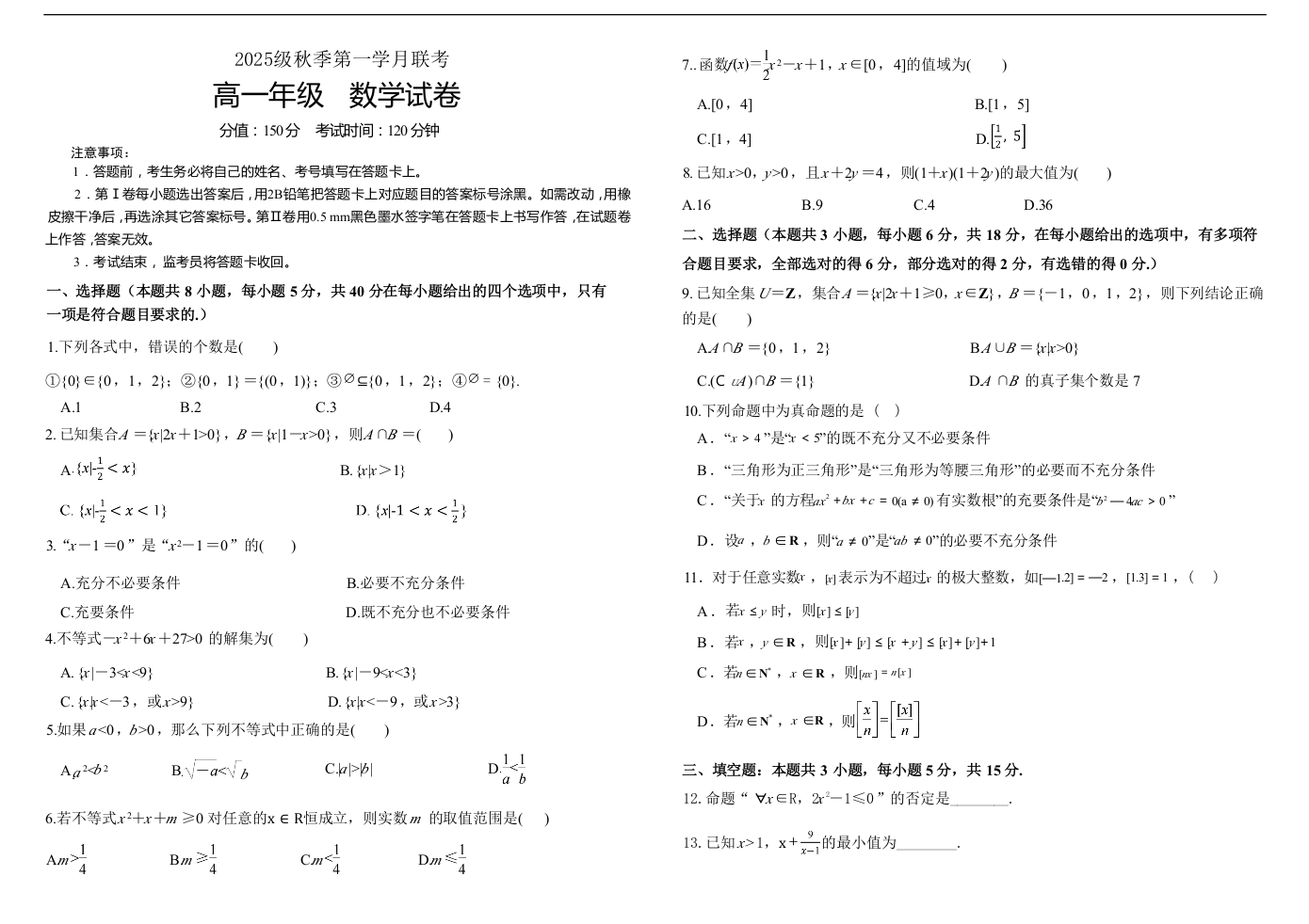 河南省天立教育集团2025-2026学年高一上学期10月联考 数学试题(含答案).docx