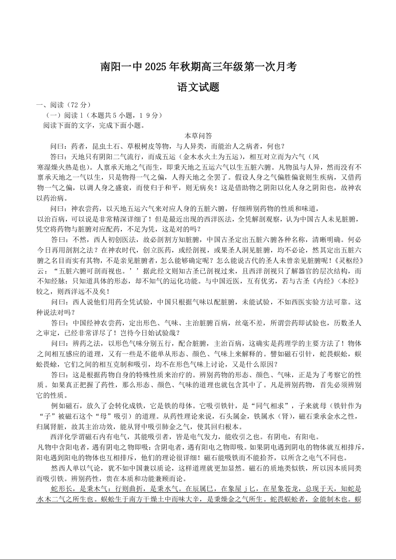 河南省南阳市第一中学2026届高三上学期第一次月考 语文试题(含答案).docx