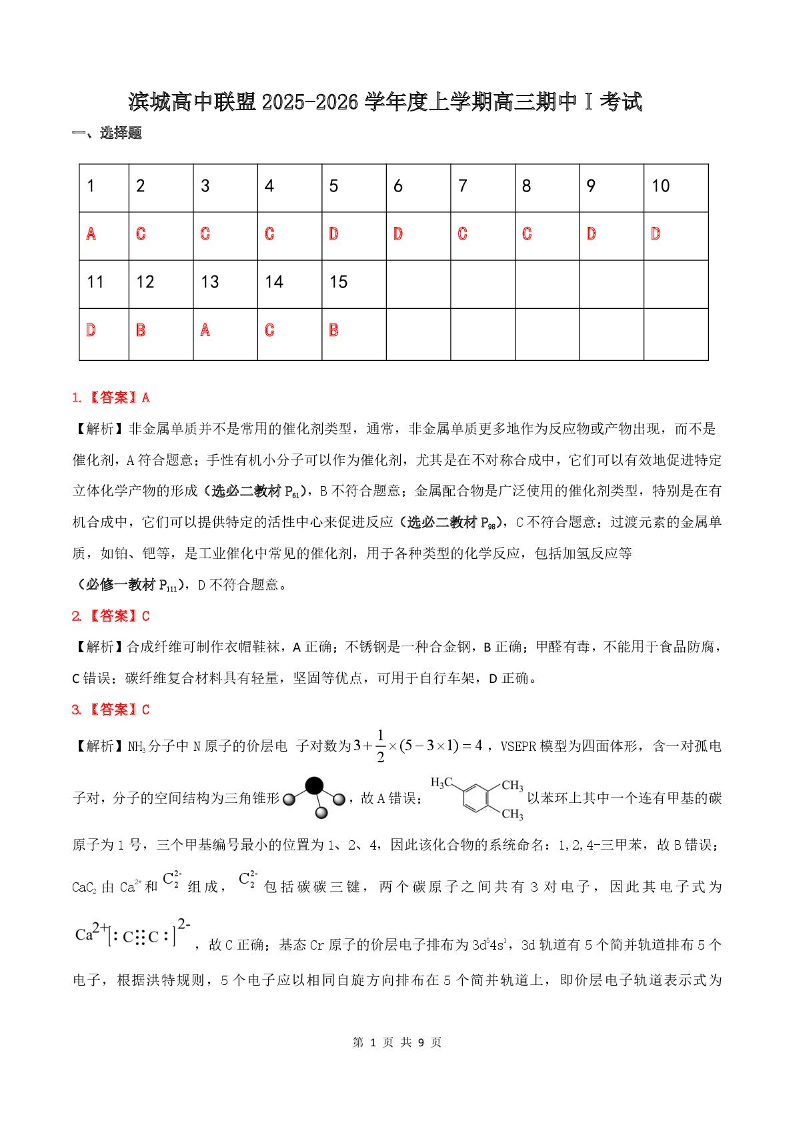 辽宁省大连市滨城高中联盟2026届高三上学期期中Ⅰ考试 化学答案.pdf