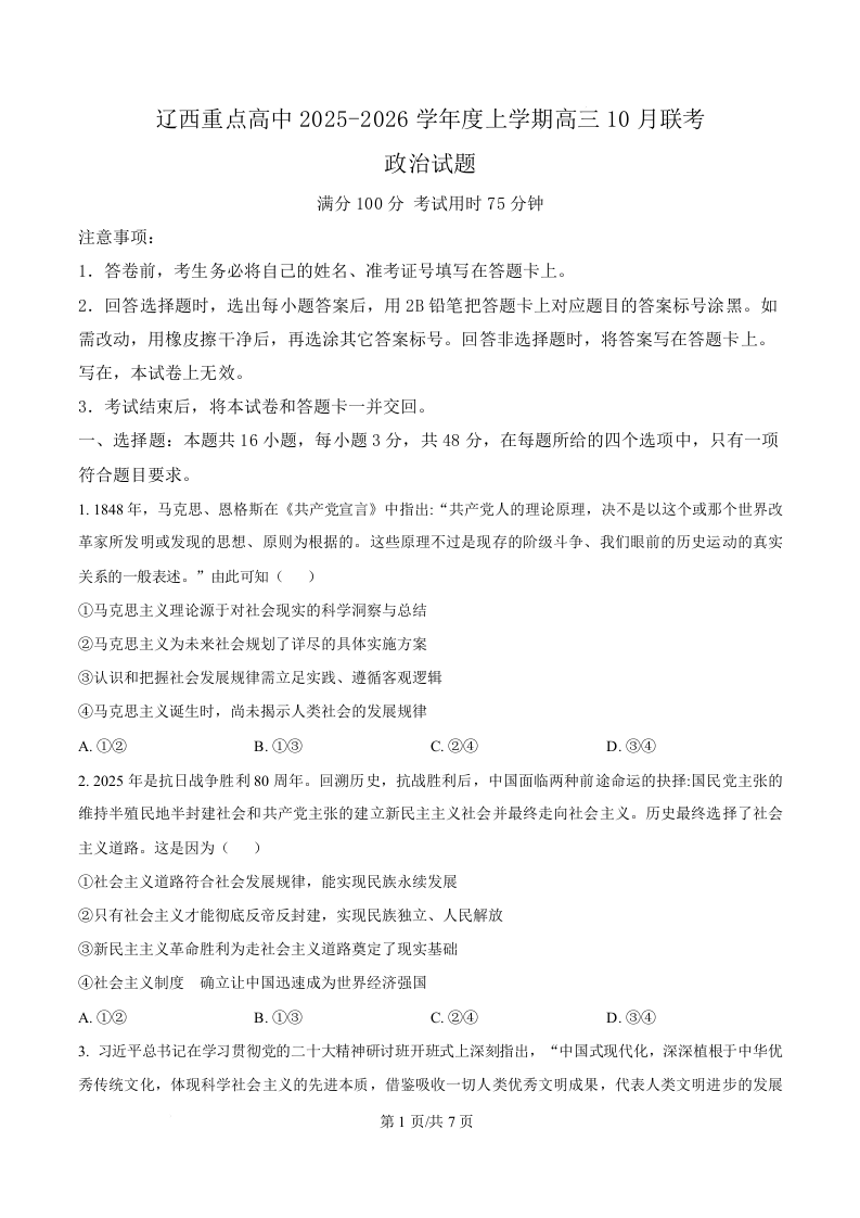 辽宁省辽西重点高中2026届高三上学期10月月考 政治.docx