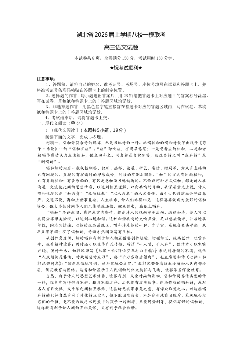 湖北省2026届上学期八校一模联考 语文解析版.docx