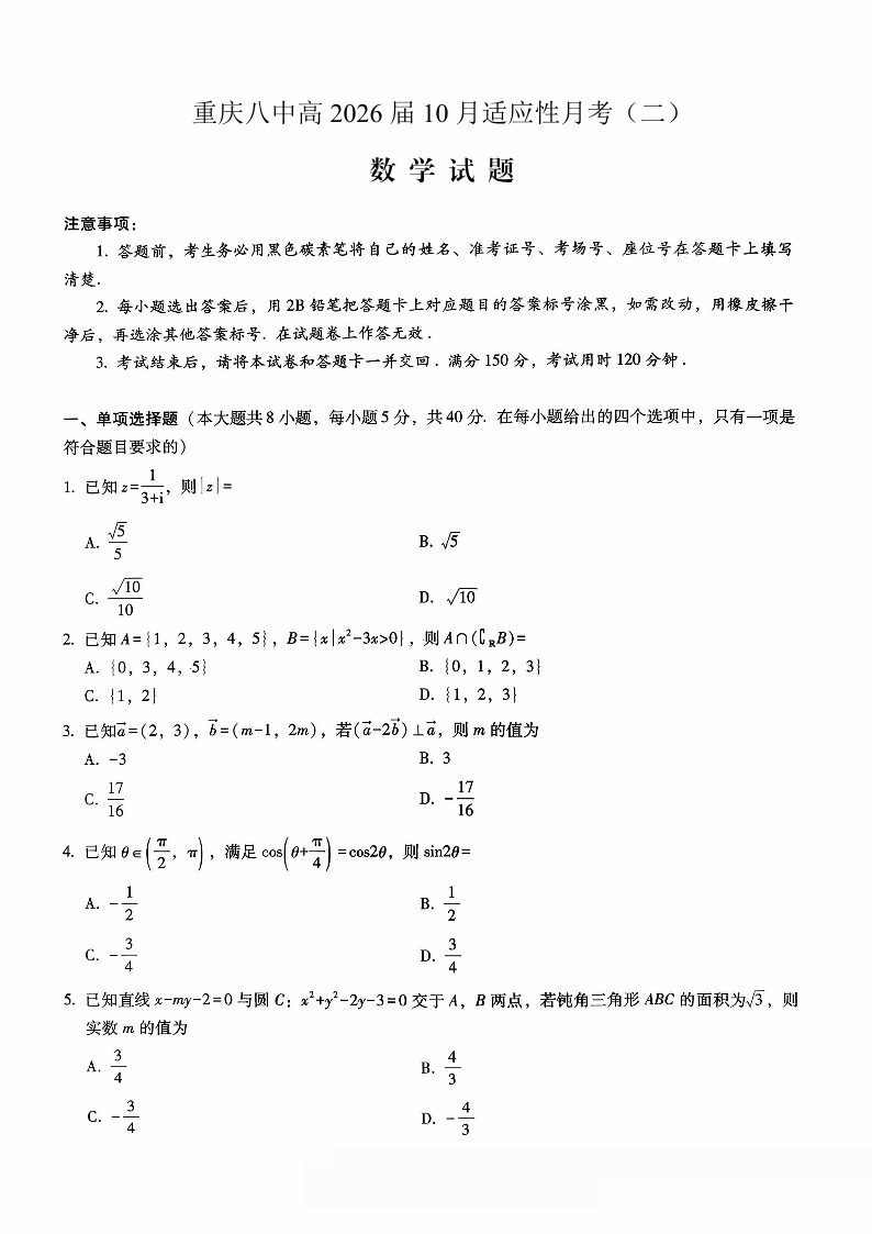 重庆市第八中学2026届高考适应性月考卷(二)数学.pdf