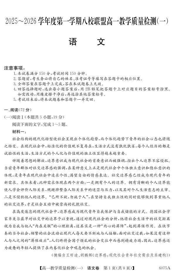 广东省2025~2026学年度第一学期八校联盟高一教学质量检测(一)语文.pdf