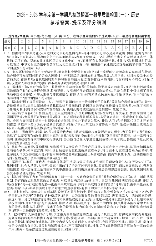 广东省2025~2026学年度第一学期八校联盟高一教学质量检测(一)历史答案.pdf