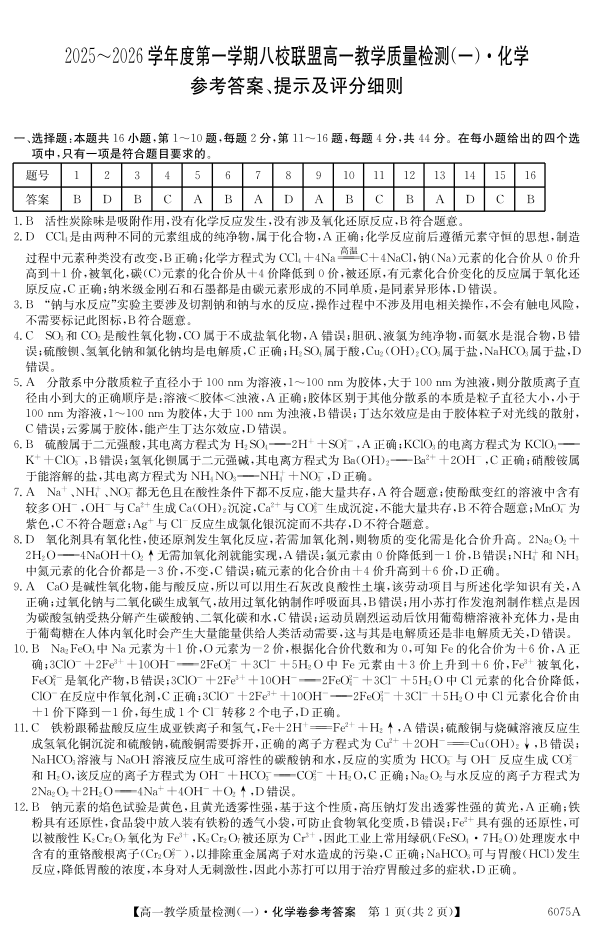 广东省2025~2026学年度第一学期八校联盟高一教学质量检测(一)化学答案.pdf