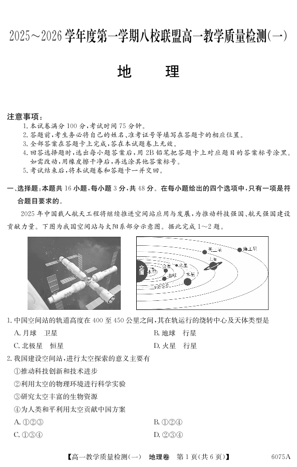 广东省2025~2026学年度第一学期八校联盟高一教学质量检测(一)地理.pdf