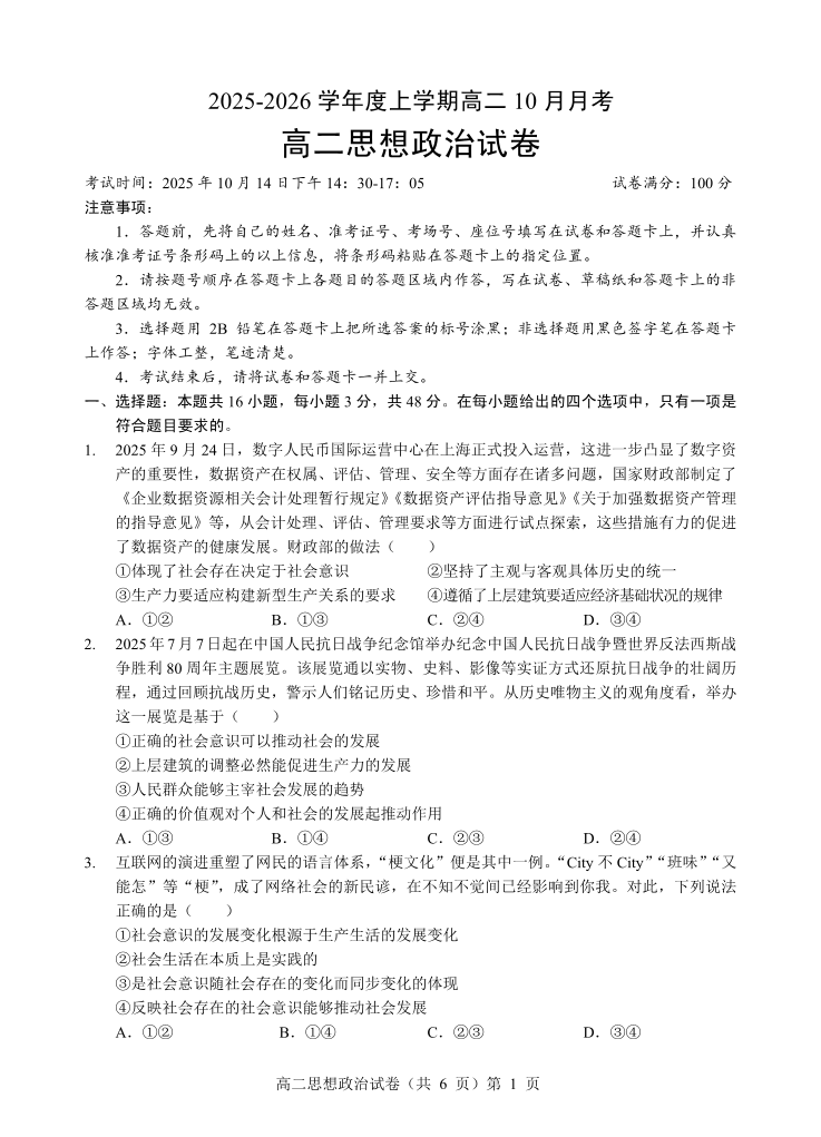 楚天协作体2025-2026学年度上学期高二10月月考 政治.pdf