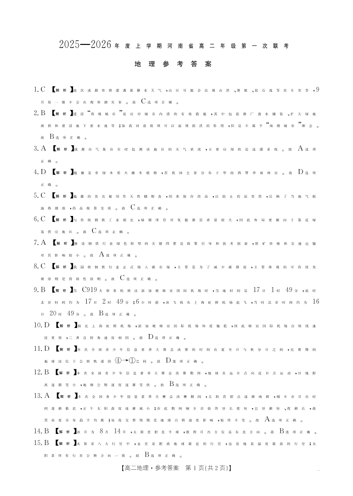 河南省2025-2026年度上学期高二年级第一次联考 地理答案.pdf