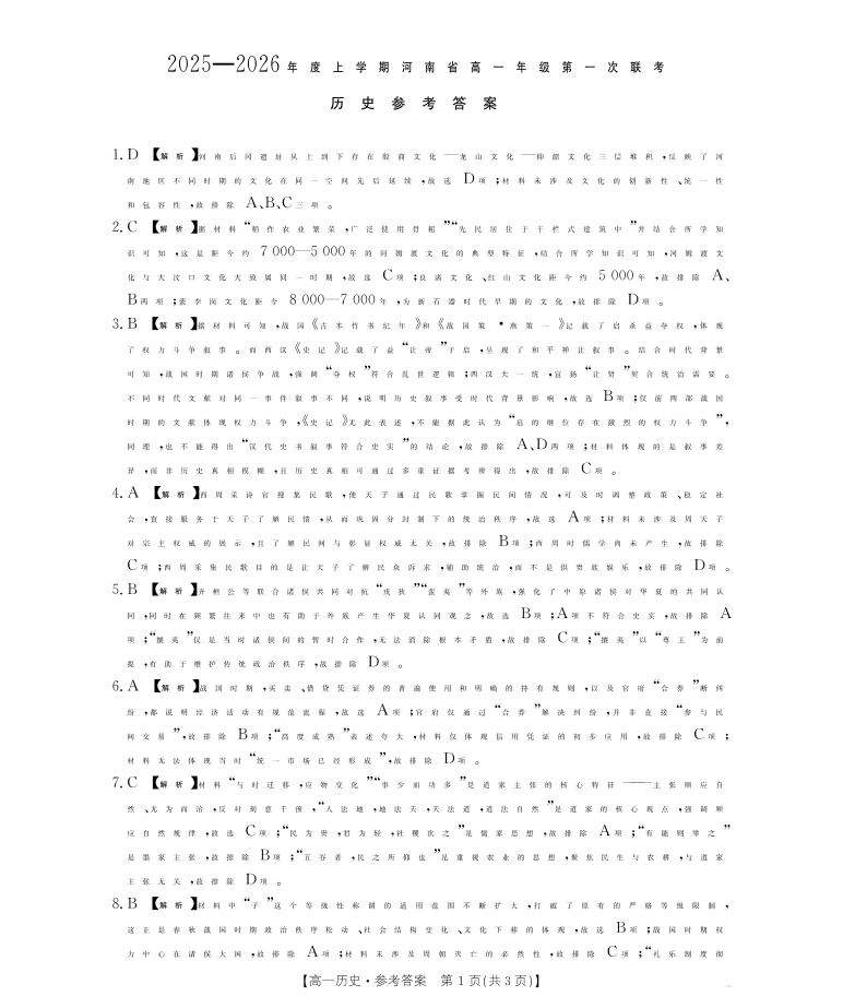河南省2025-2026年度上学期高一年级第一次联考 历史答案.pdf