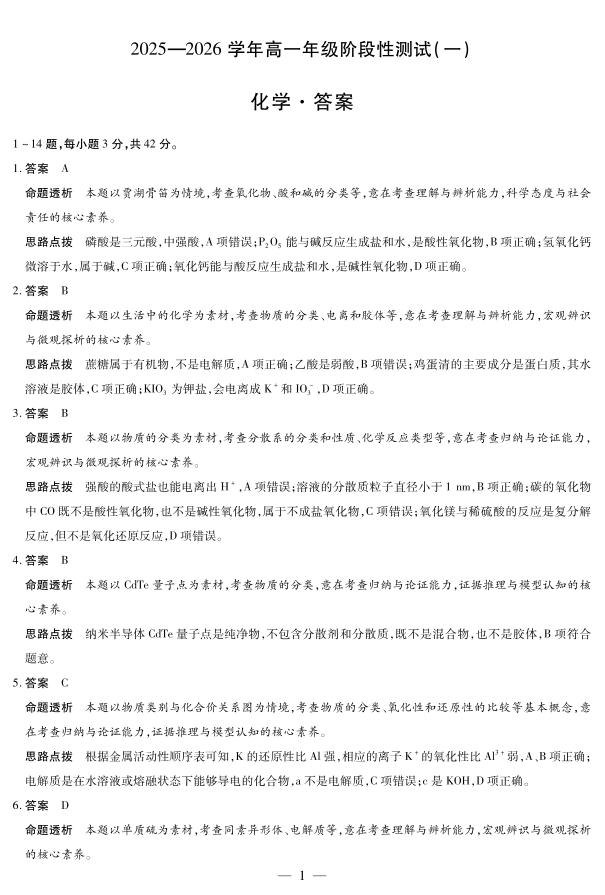 【化学答案】天一大联考·2025-2026学年高一年级阶段性测试(一).pdf