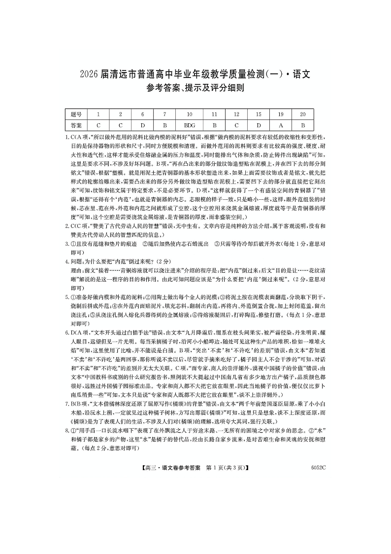 2026届清远市普通高中毕业年级教学质量检测(一)语文答案.pdf