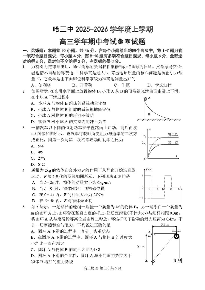 哈三中2025-2026学年度上学期高三学年期中考试 物理.pdf