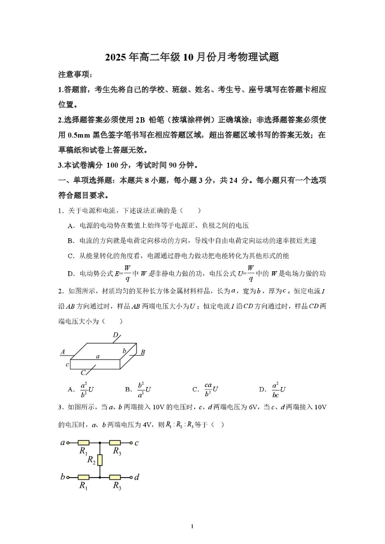 山东省济宁市第一中学2025-2026学年高二上学期10月月考 物理.pdf
