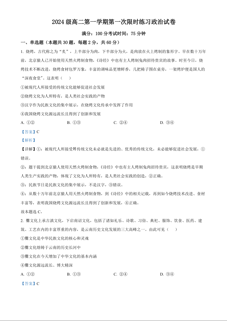 安徽省合肥市第七中学2025-2026学年高二上学期第一次限时练习 政治答案.docx