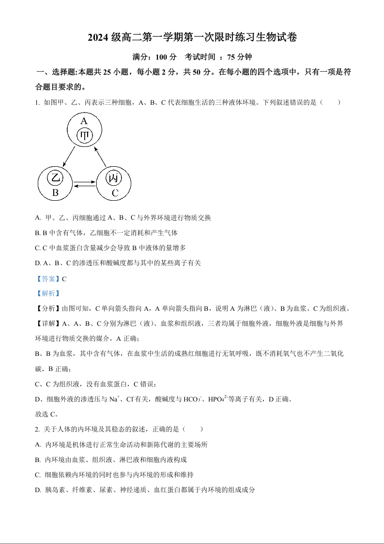 安徽省合肥市第七中学2025-2026学年高二上学期第一次限时练习 生物答案.docx