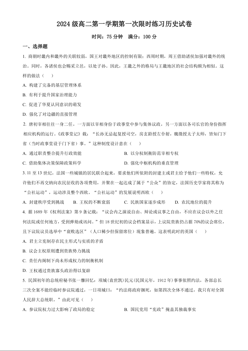 安徽省合肥市第七中学2025-2026学年高二上学期第一次限时练习 历史.docx