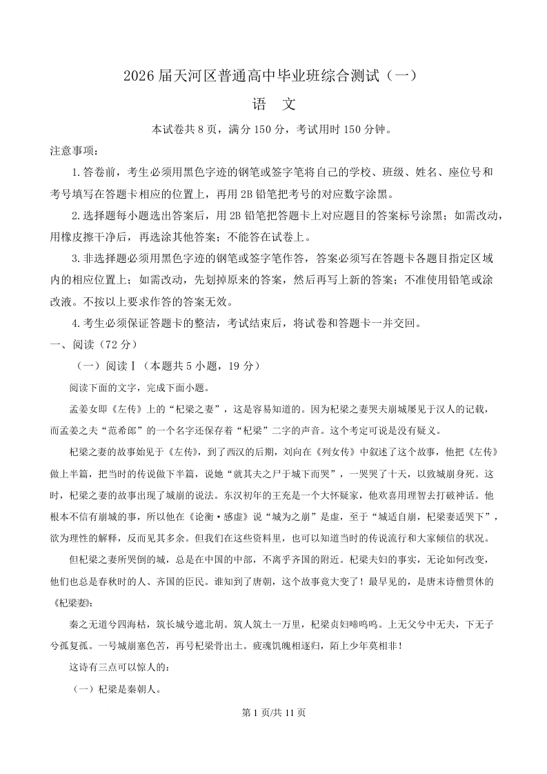 广东省天河区2026届普通高中毕业班综合测试(一)语文.docx