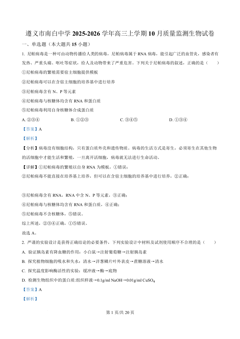 贵州省遵义市南白中学2026届高三上学期10月月考 生物答案.docx