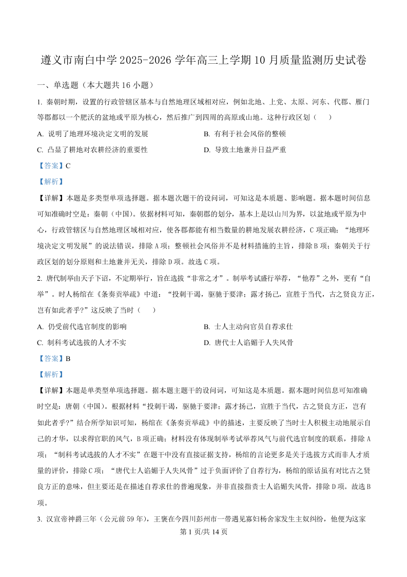 贵州省遵义市南白中学2026届高三上学期10月月考 历史答案.docx