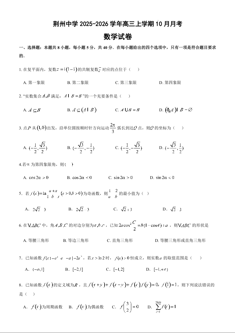 荆州中学2025-2026学年秋季学期高三年级10月月考 数学.docx