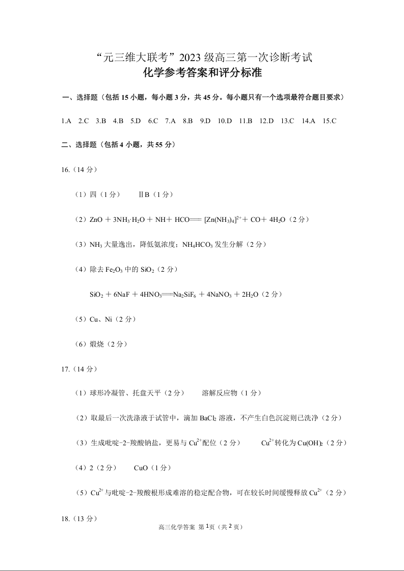 “元三维大联考”2023级高三第一次诊断考试 化学答案.docx
