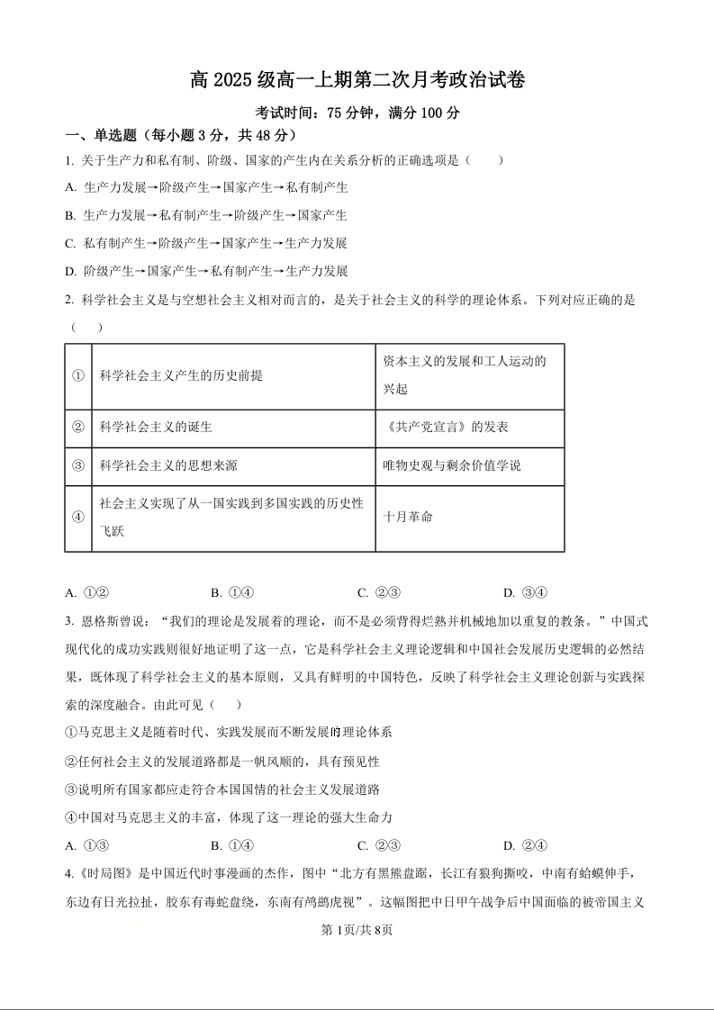 四川省南充市嘉陵第一中学2025-2026学年高一上学期第二次月考 政治.docx