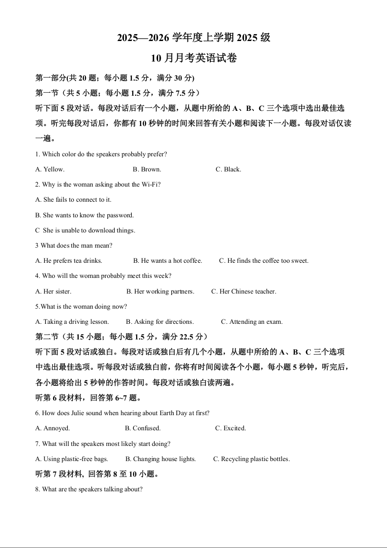 湖北省荆州市沙市中学2025-2026学年高一上学期10月月考 英语答案.docx