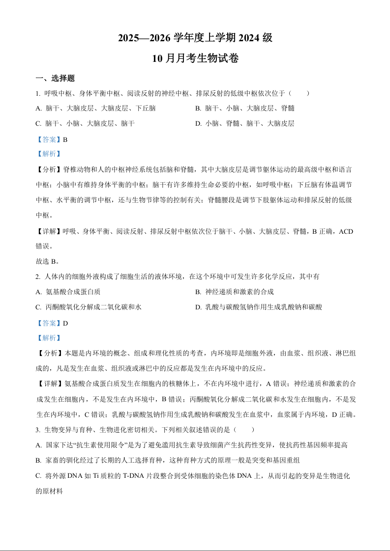 湖北省荆州市沙市中学2025-2026学年高二上学期10月月考 生物答案.docx