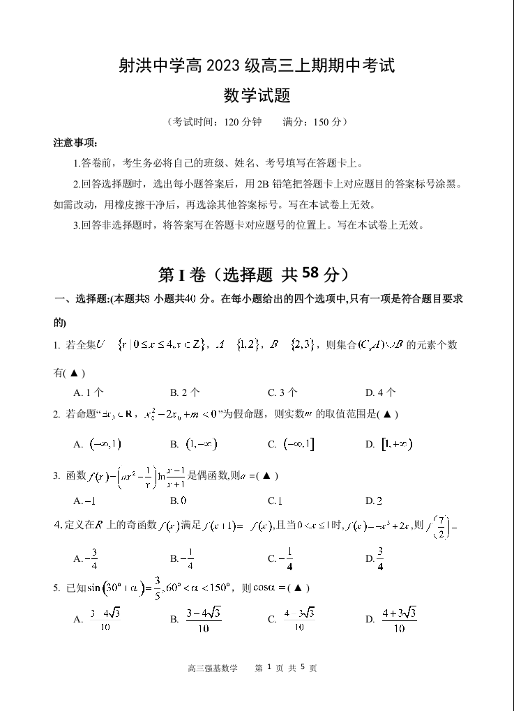 四川省遂宁市射洪中学2026届高三上学期期中考试 数学.docx