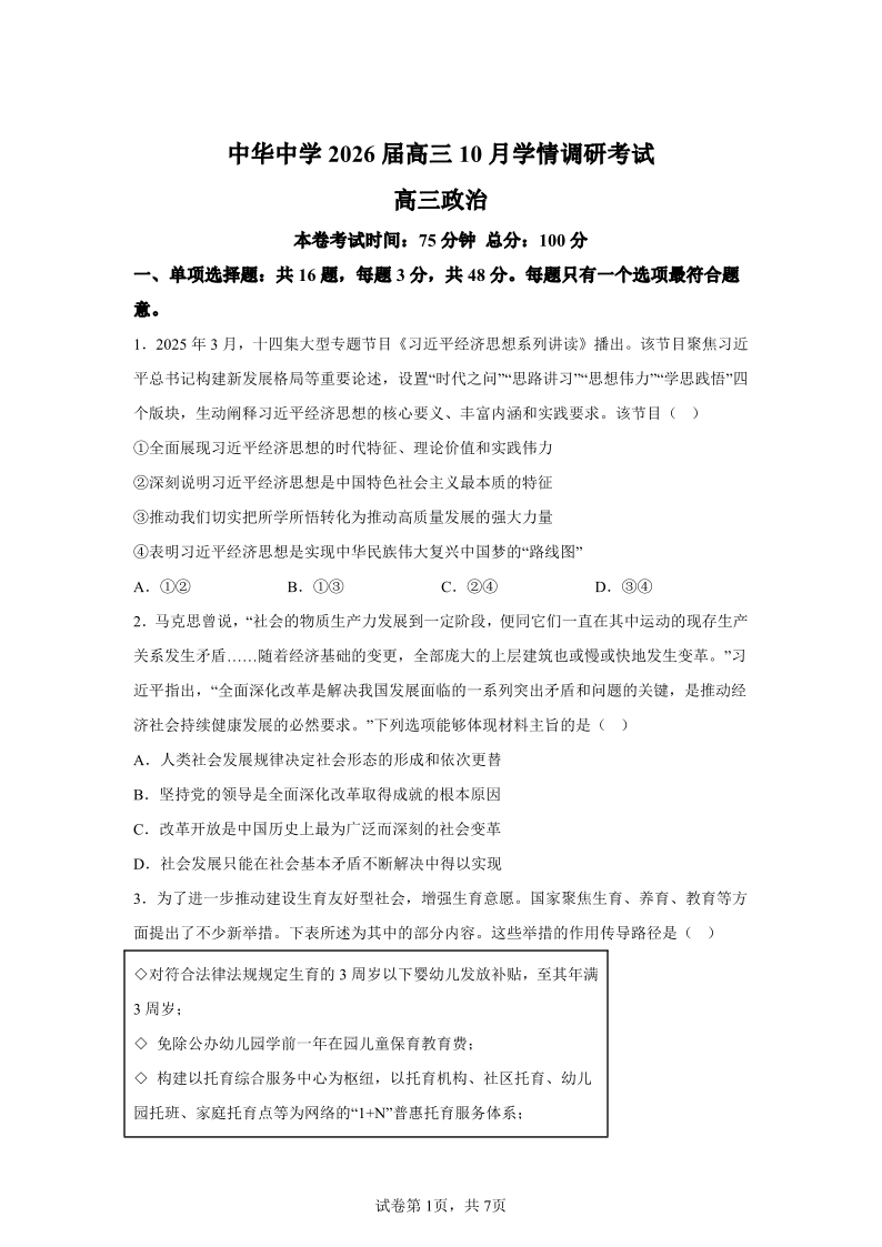 江苏省南京市中华中学2026届高三上学期10月学情调研考试 政治试题(含答案).pdf