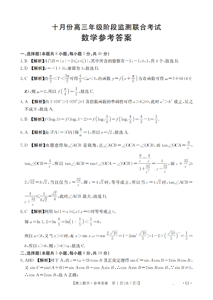 湖北省2025-2026学年十月份高三年级阶段监测联合考试 数学答案.pdf