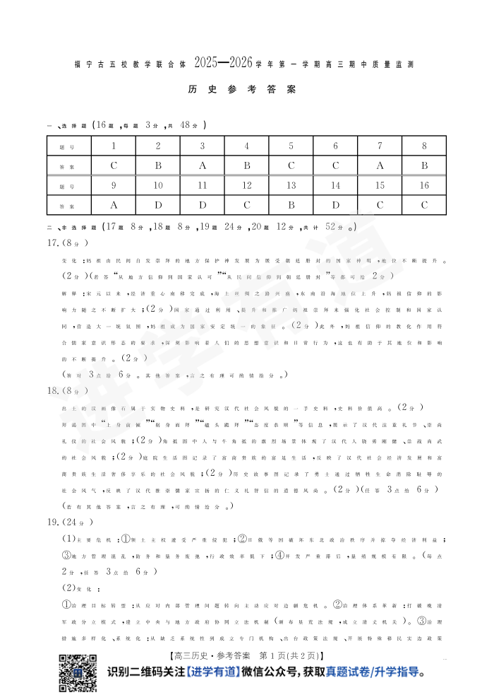 福宁古五校教学联合体2025-2026学年第一学期高三期中质量监测 历史答案.pdf
